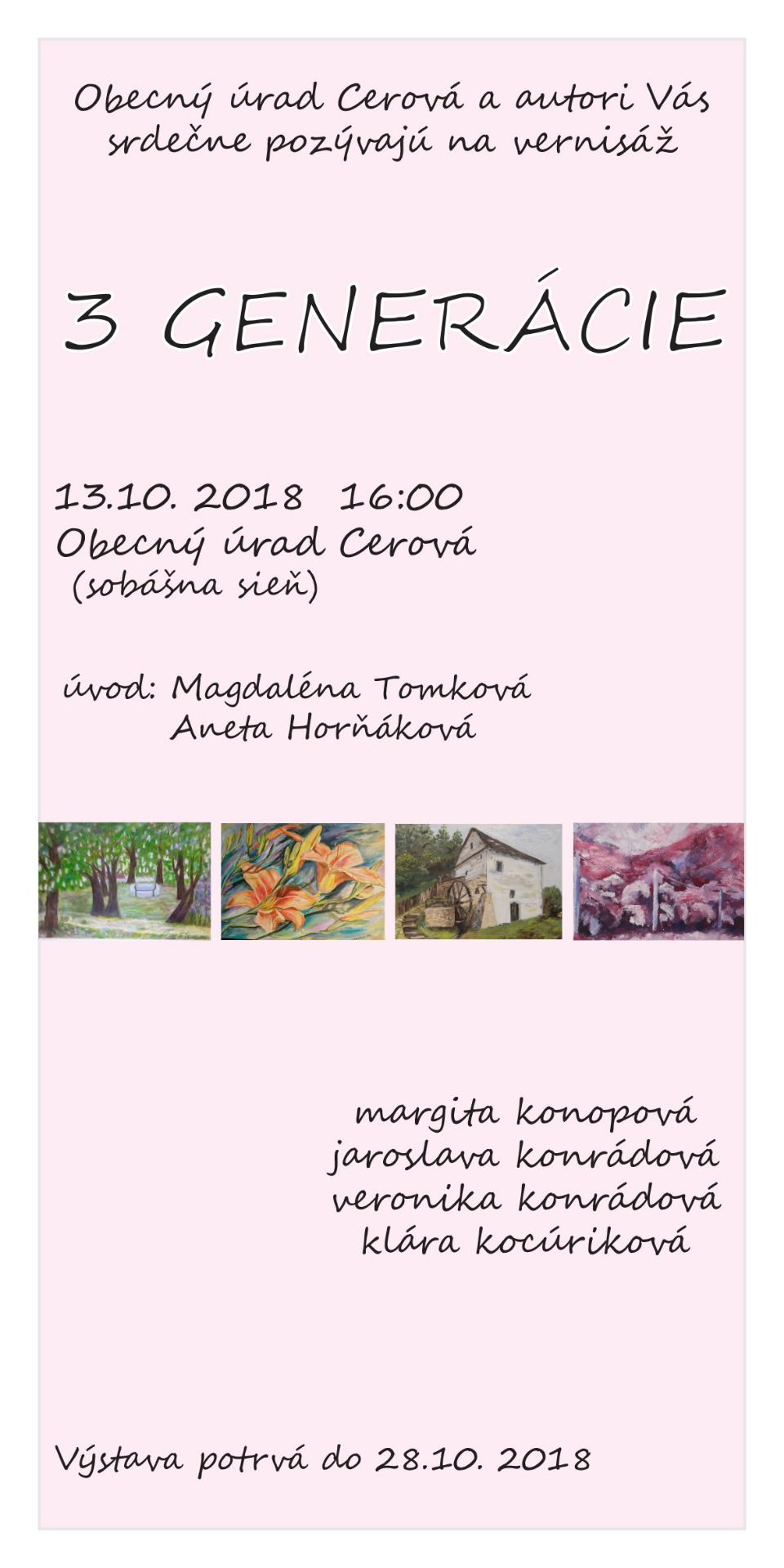 Srdečne Vás pozývame na vernisáž Margity Konopovej, Jaroslavy Konrádovej, Veroniky Konrádovej, Kláry Kocúrikovej "3 Generácie", ktorá sa uskutoční dňa 13.10.2018 o 16:00 hod na Okresnom úrade Cerová (sobášna sieň).